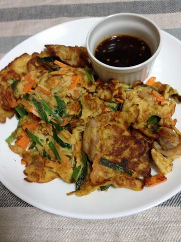 チジミが何故かむしょうに食べたくなったので作った。以下の2サイトを参考にしました。 タレがウマイ!ニラのチヂミ風 by まろんママ [クックパッド] 簡単にらチジミ by いちにのさぁん [クックパッド] [材料(16cmフライパンの2枚分)] ニラ 1束 にんじん 1/3…