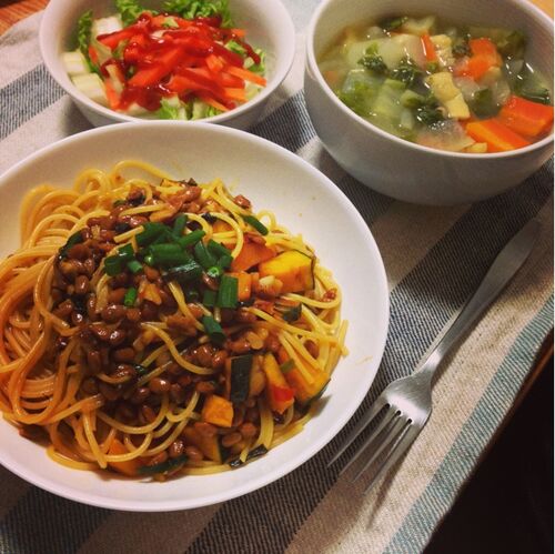 ごはん炊き忘れたので予定してたメニューが作れない! orz どうしよう・・・ってことでパスタものに急遽変更。こちら↓を参考にしました。 のりえレシピ: 納豆パスタ と かぼちゃグラタン [材料(一人分)] カボチャ 1/8個 納豆 1パック 椎茸 1枚 ニラ 2本くら…