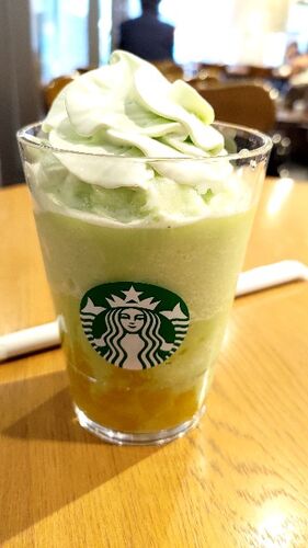 先月スタバに行ったときは臨場休店していましたが、今回はちゃんと開いてました! メロンフラペチーノをグラスで注文。 色合いが綺麗ですね。メロンの香りも良いです。ストローで吸うと果肉がすごい!クリームもしっかり濃厚で美味しいですね。 フラペチーノ…