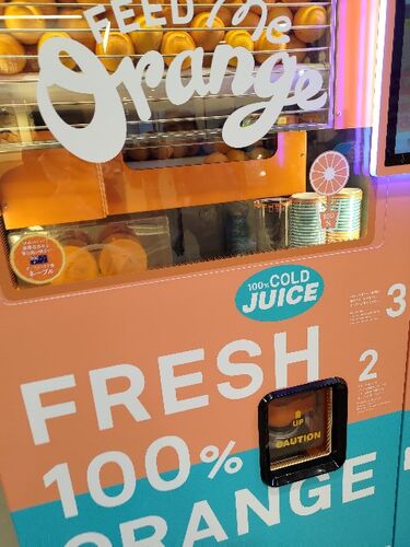 前から気になってたオレンジジュースの自販機にて、購入しました。 地区によって値段が違うようで、ここは500円。 硬貨を投入するとすぐさま搾り開始。 しばらくすると出来上がり! 完全に密閉されてますので持ち運べます。 味は濃厚でかなり甘いです。 ただ…